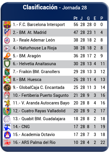 Ese sexto lugar está por ahora en poder del Anaitasuna, que ayer perdió 29x28 vs el Huesca (Schulz 3/17 - 18%). A sólo un punto se coloca el Granollers que ayer venció 29x25 al Guadalajara, con 2/4 para el chileno Rodrigo Salinas. La próxima semana, se enfrentan precisamente Anaitasuna-Granollers, en partido que podría dar clasificación a Copa EHF (pendiente, claro, de la resolución que tome el Ademar).